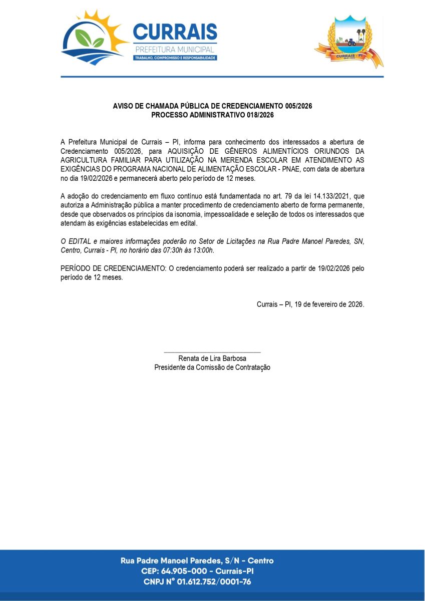 AVISO DE CHAMADA PÚBLICA CREDENCIAMENTO Nº 005/2026