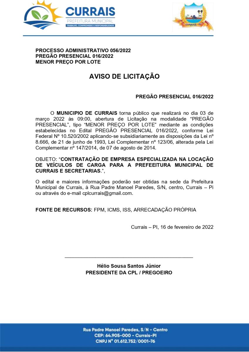 Aviso de Licitação 016/2022