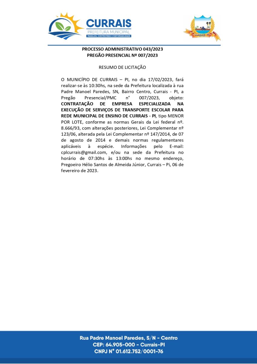 Aviso de Pregão Presencial 007/2023