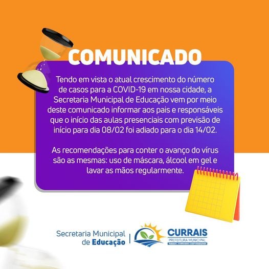 A Secretaria Municipal de Educação de Currais comunica a população do município, que em virtude do atual crescimento no número de casos de covid, informa aos pais e responsáveis que o início das aulas presenciais previsto para hoje (08) foi adiado para o próximo dia 14 de fevereiro. A decisão prever a segurança dos alunos da rede de ensino, assim como a tentativa de contenção da circulação do vírus no município. As recomendações são as mesmas: uso de máscara, álcool em gel e lavagem regular das mãos.